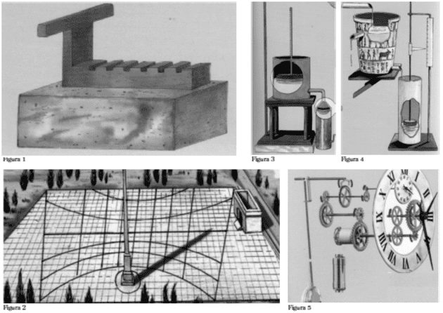 Os primeiros reloxos mecánicos con volante inventáronse na Idade Media, pero no século XVII Galileo Galilei demostrou, despois de facer moitas probas, que todas as oscilacións do peso dun péndulo tiñan a mesma duración; conseguiu cons- truír reloxos mecánicos nos que o paso do tempo era marcado polo propio movemento oscilatorio. (Figura 5).