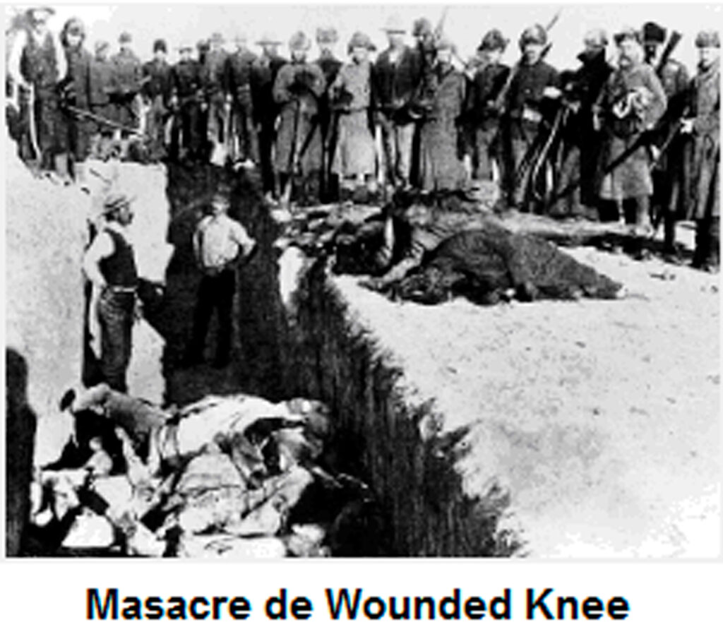 E para rematar cos nativos Lakota Sioux, ocorreu un dos episodios máis escuros da historia de Estados Unidos foi “o masacre de Wounded Knee (1890). O Sèptimo Rexemento de Cabalería atacou á poboación da reserva Pine Ridge, causando aproximadamente 300 mortos, a maioría mulleres e nenos. As guerras indias tiveron o seu final coa rendición das súas lideres e a aceptación de vivir en reservas, que ainda existen na actualidade.
